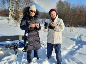 Annikki Saarenmäki tarjosi kahvit merkkipäivänsä kunniaksi, vaikka pakkasta oli yli kymmenen astetta. Kahvia nauttivat Irja Karlsson ja päivänsankari.